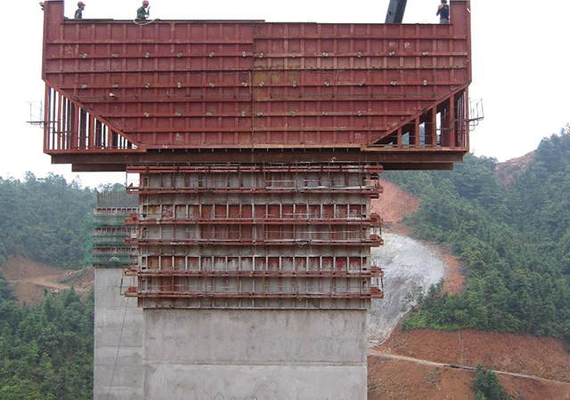 蓋梁模板采用托架法現(xiàn)澆,模板采用大塊組合鋼模,利用預(yù)留的孔洞安裝托架縱橫梁,在橫梁上拼裝好底模。然后先綁扎蓋梁鋼筋,經(jīng)監(jiān)理工程師檢查合格,再拼裝兩側(cè)的模板。